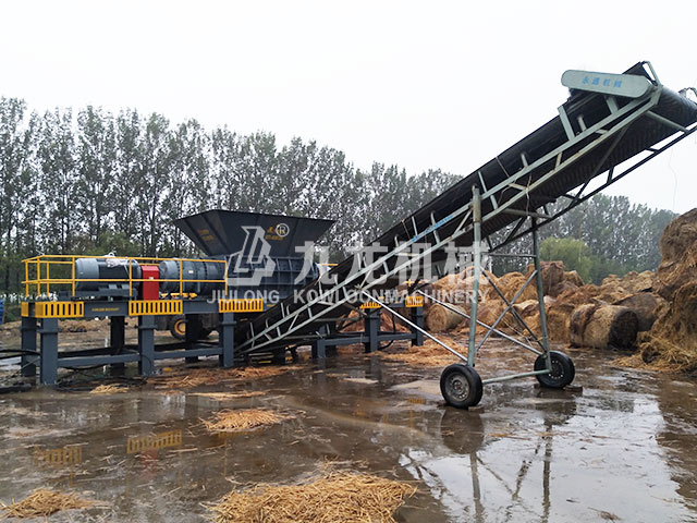 稻草粉碎機工作時,由電機帶動減速機,減速機帶動刀棍,抓機將物料投放進料斗,物料均勻的落到轉(zhuǎn)子上,兩個轉(zhuǎn)子對向剪切實現(xiàn)物料的初步破碎。