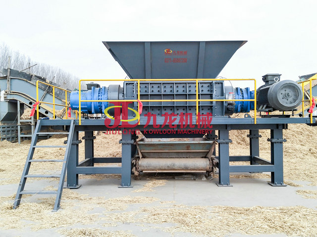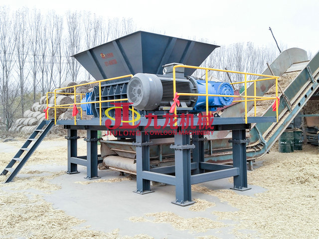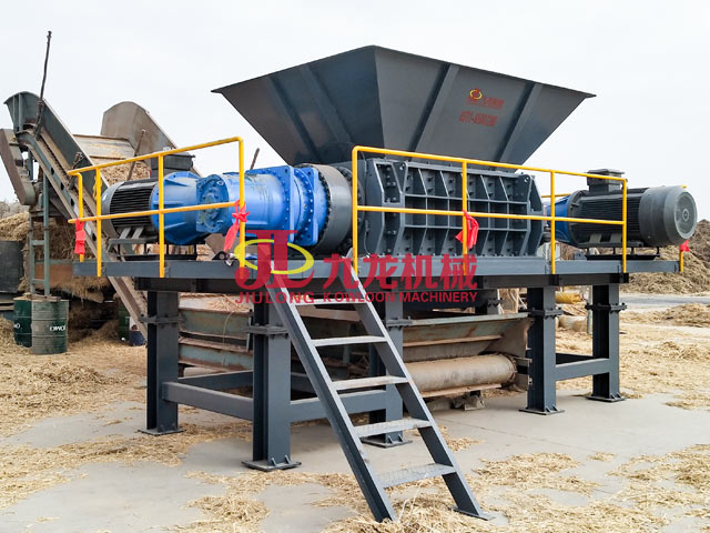農作物秸稈通過輸送機送至大型鍘草機進料口到粉碎室,該設備采用雙電機、減速機直連設計,驅動粉碎室內部雙軸(注明:雙軸上裝備有多齒牙刀具)進行棍動、剪切、擠壓等方式使物料進行粉碎,粉碎后的物料通過下輸送至集料地點。
